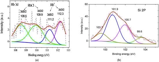 The presence of Si 1s is likely due to the glass being attacked during distillation by the acidic fluid handled. In this case, Si was identified as a contaminant. The narrow spectra for each element were processed using Origin 8.1 software. In some cases, each spectrum was deconvoluted to obtain information about the chemical environment of each element and its chemical bonds. The chemical composition of the residual solid was found to include Rb, Si, S, O, Cl, N, and C. The presence of Rb, Cl, N, C, and O is attributed to dissolved organic compounds in pharmaceutical waste liquors. Although Rb is present in a very small atomic proportion, it appears to bind with Cl, as suggested by the XPS doublet observed at 108.5 and 109.9 eV in the narrow spectrum of Rb. Also observed in the same figure, Figure 8, is a doublet that peaks at 111.24 and 112.28 eV, which is attributed to the 3d5/2 and 3d3/2 signals of Rb0.