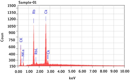 Figure 9 shows the analysis of the energy-dispersive X-ray spectra (EDS) corresponding to the residue from solar distillation, revealing the presence of C, N, Rb, and Cl. Table 3 presents the percentage composition of each element, with C being the most abundant at 63.85%, followed by N and Cl at 18.94% and 3.46%, respectively, and Rb at a much lower value of 0.4%.