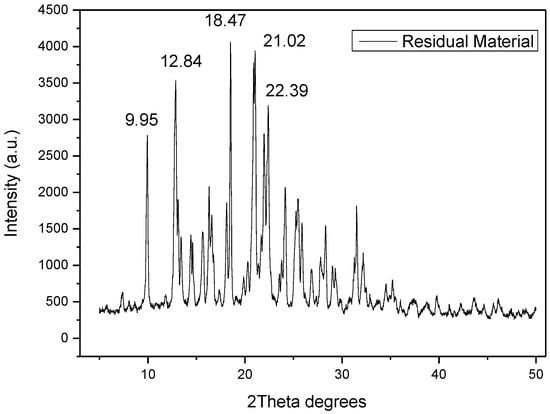 In addition, the crystalline phases in the residual material were identified through the diffraction lines (Figure 10), which are associated with SiO2 (JCPDS 002-0242), primarily from the glass, most likely due to the glass being attacked in the acidic medium during distillation. Other crystalline phases, though in smaller proportions, can also be found in the residual material, originating from the dissolved glass.