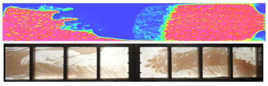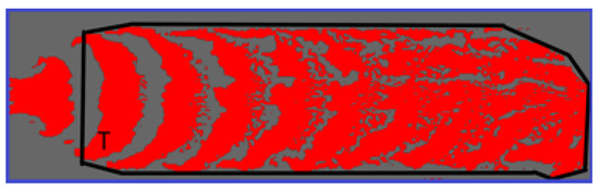 With an injection rate of 15 L/min, the particle concentration distributions of the numerical simulation and physical experiment are shown in Figure 2. The particles move forward within the fracture in the form of slugs. The different colors represent different particle concentrations; the red area has a higher particle concentration, and the blue area has a lower particle concentration. As shown in Figure 2, the particle distribution obtained via numerical simulation is the same as in the experiment. Therefore, the numerical method proposed in this paper can effectively simulate particle migration in the fracture.