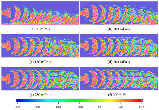 As shown in Figure 5, when the viscosity is equal to 50 mPa·s, the concentration of the particles is at a minimum, mainly because a large number of particles have settled at a low viscosity. When the viscosity increases from 100 to 200 mPa·s, the concentration of the particles decreases due to the combination of liquid impact and particle settling. When the viscosity rises from 200 to 300 mPa·s, the concentration of the particles remains unchanged. This stability occurs because the forces exerted by the fluid on the particles and the inter-particle forces reach an equilibrium state under high-viscosity conditions, maintaining a stable concentration of the particles.