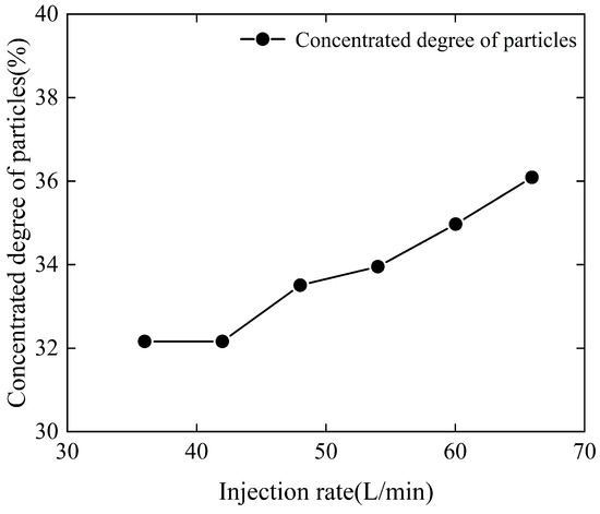 Particle distributions under different injection rates of 36 L/min, 42 L/min, 48 L/min, 54 L/min, 60 L/min and 66 L/min.