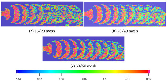 Particle distributions under different particle diameters of 16/20 mesh, 20/40 mesh and 30/50 mesh.