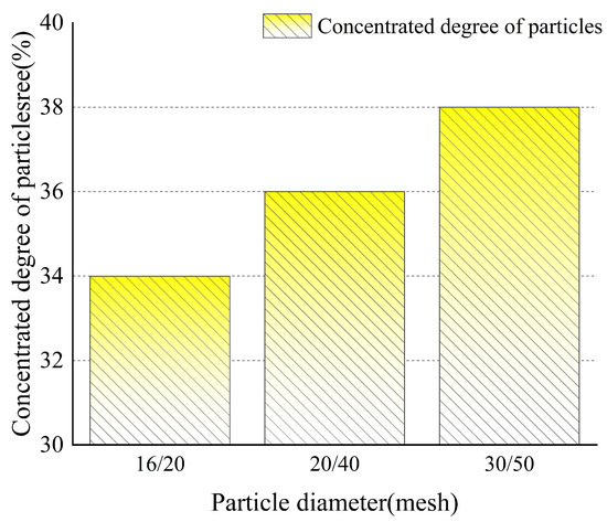 Figure 9 shows that particle density significantly affects both the degree of dispersion and particle settlement during particle migration. The higher the particle density, the more particles settle to the bottom of the fracture. On the other hand, when the particle density is less than 2200 , the particle distribution is obviously more dispersed than when the particle density is greater than 2200 . Figure 10 also shows this phenomenon. When the particle density is above 2200 , the concentration of the particles obviously increases with the increase in particle density. In general, the higher the particle density, the lower the degree of particle dispersion, but more particles settle at the same time, so it is necessary to consider these two trends comprehensively when optimizing the particle density.