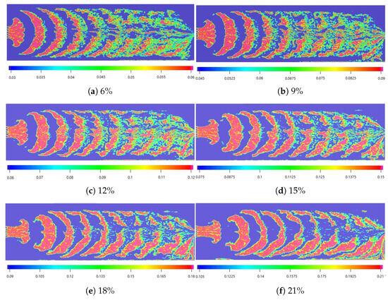 Figure 7 shows that when the injection rate is low, the particles are more easily dispersed by the liquid, leading to back-and-forth particle aggregation. This particle aggregation can easily cause fracture plugging and reduce the fracture’s diversion capability. Additionally, a higher injection rate results in fewer particles settling. Figure 8 also shows that with the increase in injection rate, the concentration of the particles gradually increases, reflecting a gradual decrease in the degree of dispersion. Therefore, a high injection rate is conducive to the stability of channel fracturing and the stability of particle concentration for temporary plugging.