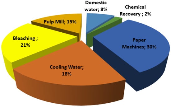 The pulp and paper industry is undergoing a significant transformation towards sustainability due to its high resource consumption [1]. The pressing concern of climate change has been pivotal in driving environmentally conscious technology transfer initiatives [2,3,4]. The pulp and paper (P&P) industry is one of the largest global water consumers, generating significant volumes of wastewater with high pollutant loads, such as chemical oxygen demand (COD) and suspended solids. Optimizing water management in manufacturing processes is essential for reducing environmental impacts at various stages, such as washer filters, bleaching, liquor clarification, cooling towers, and boilers. Implementing efficient water usage practices helps conserve this precious resource and minimizes wastewater discharge and pollution [5]. Figure 1 illustrates a diagram that depicts various aspects of water usage in a pulp and paper mill. The water, after use, turns into effluent wastewater containing contaminants, which requires treatment before discharge into the environment.