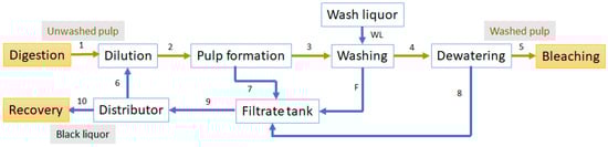 Brown stock washing separates the dissolved solids into an aqueous phase called black liquor, which is sent to the evaporators. The fiber is divided into an aqueous suspension as washed pulp. This separation process consists of several stages: dilution, pulp formation, washing, dewatering, filtration, and distribution. For modeling, the mass balance equations for the liquor stream are represented for every stage using notations from Figure 2 and operations described in Figure 7 as follows [18]: