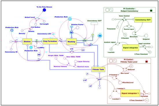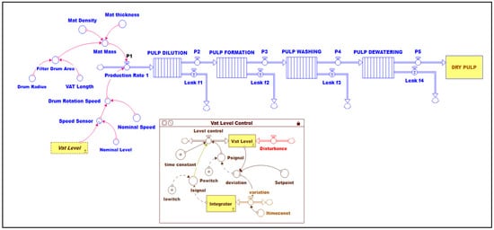 While theoretically, optimal solute removal would be achieved by washing pulp with fresh water in each stage of a multistage system, this approach results in a significant volume of highly diluted filtrate, making it impractical for industrial applications. Modern multistage wash plants have adopted the countercurrent principle to enhance efficiency. In this setup, the wash medium flows toward the pulp flow [33]. The countercurrent design ensures that the pulp comes into contact with the cleanest available wash liquor before exiting the final washing stage. The filtrate from the last stage is redirected back towards the initial stages against the pulp flow, serving as wash liquor for each subsequent stage until it reaches the first washing stage again. As a result, the filtrate from the initial stage has accumulated higher concentrations and is suitable for further processing in other areas of the facility, such as an evaporation plant. After the third-stage washing cycle, the purified pulp stock is gathered in the storage tank and awaits transfer to the bleaching plant. This innovative approach optimizes resources and minimizes wastage in industrial washing processes. The system dynamics methodology is employed in this paper to examine the effectiveness of a multistage washing line equipped with three washers, depicted in Figure 18. The model incorporates all three material streams, comprehensively analyzing the system’s operations. The pulp stream line’s input is represented by the vat’s actual level, which is regulated by the drum speed of the washers. By employing this methodology, the system dynamics approach allows for a detailed examination of how different variables interact within the system, offering a holistic perspective on its functionality and potential areas for improvement. Cost savings in brown stock washing necessitate control of the dilution factor and efficiency.
