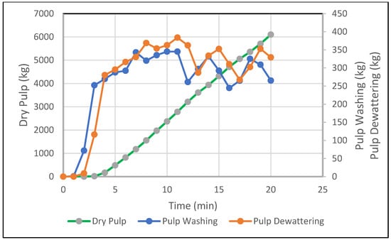 where PRi is the mass flow rate (production capacity) of the pulp [kg/min], and fi is the pulp loss fraction (%). According to theoretical considerations for drum filtration, the most important parameters for pulp mat formation on the drum are drum speed, effective filtration pressure, pulp slurry temperature, washer inlet consistency, and pulp air content [32]. These variables can be selected to calculate the specific washer surface load and, by this, the washer capacity: