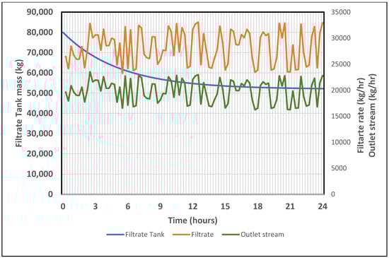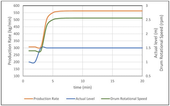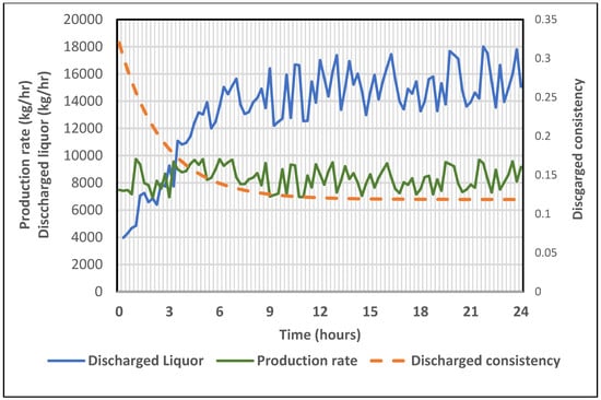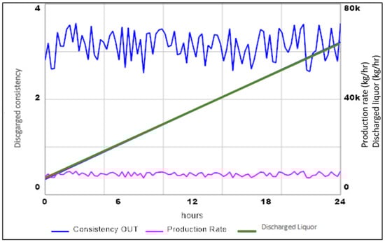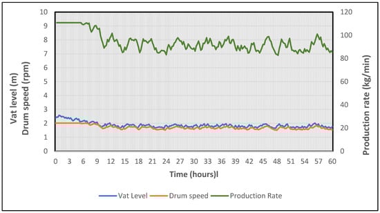 Maintaining an accurate balance between the quantity of washing water utilized and the desired cleanliness of the pulp is critical in the brown stock washing process. Excessive washing losses can prove to be detrimental for several reasons. Firstly, high washing losses can lead to significant material wastage, impacting the overall efficiency and cost-effectiveness of the production process. Moreover, excessive use of washing water increases water consumption and raises environmental concerns about water usage and disposal [33]. The liquid level is maintained in the vat at a predetermined set point, achieved when there is an equilibrium between the vat’s dilution flow and the drum speed, which governs the system’s hydraulic capacity. Figure 7 demonstrates how the VAT level is controlled during an operation that experiences a 13% fluctuation in the production rate.