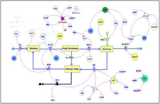 The system dynamics modeling tool STELLA Architect was employed to model the operations of brown stock washing as a dynamic system in an intuitive environment. The system dynamics (SD) approach is based on understanding the complex relationships among different elements within the system. Pioneered by Forrester [29], the SD methodology offers a versatile modeling and simulation framework that effectively addresses dynamic complexities in various problem domains. Its strength lies in comprehending and navigating heightened complexity, particularly from causal influences and uncertainties within a system. By focusing on the interplay between physical flows, information flows, delays, and capacity planning policies, the SD methodology illuminates the dynamics of key variables within complex systems. It aims to identify optimal decisions for expanding existing capacities to enhance long-term system profitability. Central to SD theory are two fundamental concepts: stocks and flows, which, along with feedback loops, capture the intricate dynamics within a system [30,31].