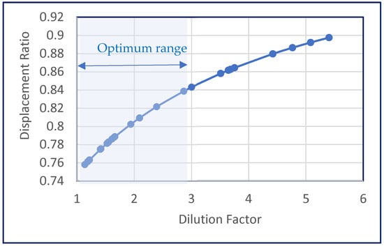 The displacement ratio depends on the amount of liquor used for washing, the feed and discharged consistency, and the dilution factor. Introducing random variations in the production rate and wash liquor can disrupt the dynamic system, enabling a closer examination of the relationship between key parameters within the model. Among these parameters, the system dynamics model determines the dilution factor, displacement, ratio, wash loss, efficiency factor, and the correlation between them. Illustrated in Figure 14 is the correlation between the dilution factor and displacement ratio, derived from analyzing how the system dynamics model responds to random disturbance. These findings have been verified by field experiments documented in various literature sources. The dilution factor should be above 1 to guarantee effective washer performance, but for rotary vacuum drums, an optimal dilution factor typically falls within the range of 1 to 3.