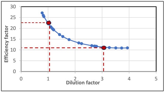 Figure 15 illustrates the relationship between wash loss and dilution factor computed from random disturbance. Washing loss and dilution factor are interrelated variables. For constant processing conditions and washing efficiency, the relationship of wash loss to dilution factor shows that as dilution factor increases, i.e., more wash water is used, the washing loss decreases, i.e., more dissolvable solids are recovered by washing. This figure also shows a diminishing return of dissolvable solids recovered as the dilution factor increases and more significant amounts of wash water are used. The concept of washing system efficiency, expressing the fraction of dissolved solids removed in the system, is calculated according to the Norden efficiency factor, E-factor [33]. With the notation used in the system dynamics model of the dissolved solids stream in Figure 13, the E-factor is calculated according to the formula: