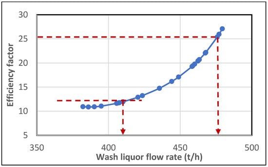 Selection of the wash liquor flow rate based on the efficiency factor optimum range.