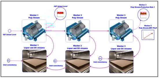 Efficient washing enhances pulping chemical recovery and reduces energy costs associated with recovery evaporation. This leads to a decreased demand for bleach chemicals. It lowers mill discharges of BOD, COD (chemical oxygen demand), and AOX (Adsorbable Organic Halides), contributing to environmental sustainability and cost-effectiveness within the pulp manufacturing process [26,27]. To model the washing system effectively, it is essential to consider individual washers and the entire washing line as a unified unit. Figure 2 overviews the critical variables for modeling a single stage or the complete washing line. The model encompasses all primary operations of the rotary vacuum drum process [13]. While determining the overall washing efficiency of the entire line is crucial, evaluating the individual performance of each washing device is equally significant for operational optimization.