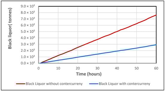 Countercurrent washing is a widely recognized and efficient technique used in multistage kraft pulping to enhance chemical recovery and reduce environmental impact. This method, involving the flow of black and white liquor in opposite directions, allows for the effective extraction of chemicals and impurities from the pulp, thereby improving the overall efficiency of the pulping process. Mills can recover valuable pulping chemicals while minimizing water consumption and chemical waste by optimizing the flow dynamics in countercurrent systems. These advantages are crucial for the sustainability of kraft pulping operations in the paper industry. As illustrated in the brown stock washing line model (Figure 18), our findings show a significant improvement in wash liquor savings—an 8-ton per hour reduction in wash liquor consumption in a countercurrent configuration compared to a conventional configuration (Figure 20). This result is consistent with previous studies that have demonstrated the benefits of countercurrent washing. For example, Kamal et al. (2011) [34] found a similar reduction in wash liquor usage when switching to countercurrent configurations in kraft pulping systems, highlighting the method’s potential to improve chemical recovery and reduce environmental impact. Additionally, Mori et al. (2019) [35] reported that countercurrent washing reduces water consumption and enhances chemical recovery efficiency, aligning with our observations in the current study. The improvements observed in our study further emphasize the importance of countercurrent washing in optimizing pulp mill operations. While previous investigations have focused on the theoretical benefits, our results demonstrate how countercurrent washing can save operational resources when scaled to industrial production rates. These findings support the growing body of literature advocating for countercurrent systems to improve the economic and environmental performance of kraft pulping operations. More to the point, as a prospective study, sensitivity analysis on key parameters like dilution factor and feed consistency to validate model robustness could be performed.