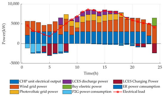 Figure 5, the electrical load demand of the power supply unit is primarily met by the CHP, PW, PV, and LCES. During peak hours from 8 a.m. to 5 p.m., the demand for electricity rises sharply. However, the CHP has limited power generation capacity, and the LCES supplements the CHP by discharging stored energy, thereby ensuring a reliable power supply during peak periods. Outside of peak hours, when power demand decreases, the system’s operation shifts. The surplus generation capacity of the CHP is better utilized, with the excess power being stored in the LCES rather than supplied directly to consumers. This ensures the system has sufficient reserve energy to meet demand during future peak periods. Additionally, during low-demand nighttime hours, the P2G system operates, converting excess electricity into natural gas, contributing additional energy to the natural gas supply system.