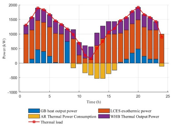 Figure 6, the thermal load is primarily supplied by the WHB and the LCES. To ensure a continuous and stable electricity supply, the CHP unit must operate at high-load conditions for extended periods. During high-load operation, the waste heat generated by the CHP is recovered by the WHB, meeting the system’s thermal energy demands. During periods of peak thermal load demand, the WHB plays a critical role in ensuring that the thermal requirements of the system are fully met. Additionally, the compression heat produced by the LCES serves as a key source of thermal energy. By storing excess heat generated during system operation in hot water tanks, the LCES helps maintain a stable supply of thermal energy.