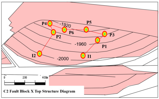 Top surface structure of well cluster in block CB oilfield. Well Is are injection well and Well Ps are production well.