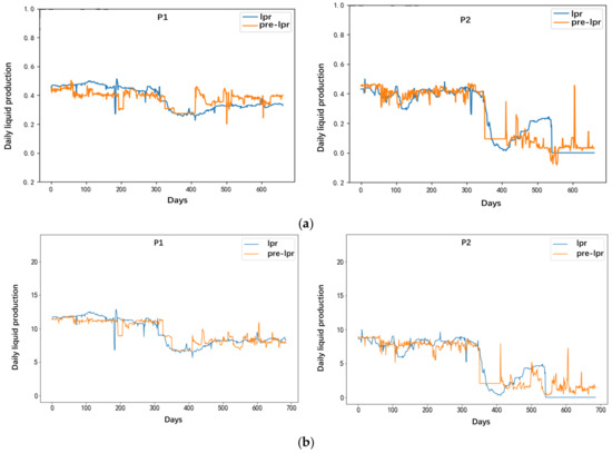 Fitting curve of liquid production rate of single well in well group of block CB oilfield area. (a) Fitting effect of liquid production rate for common GNN. (b) Fitting effect of liquid production rate for TAGNN.