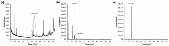 GC-MS chromatograms of olive oil (a), thyme oil (b), and oregano oil (c).