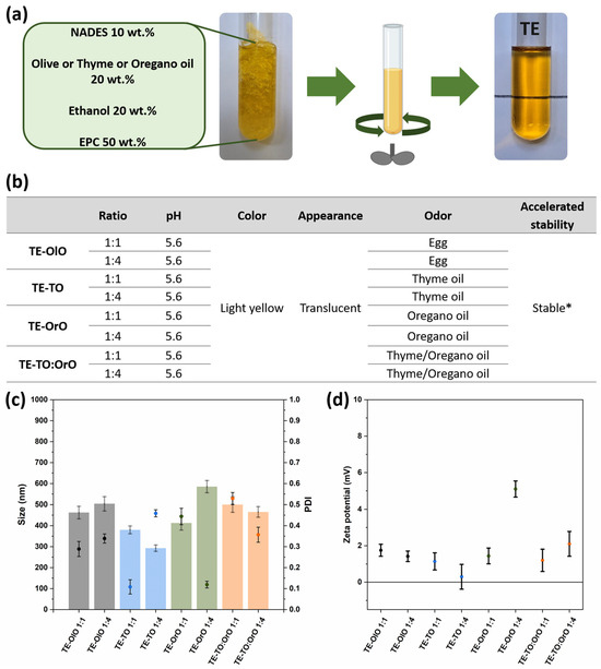 TEs preparation (a) and organoleptic properties (b), size ((c)—bar chart), polydispersity (PDI) ((c)—dot chart) and zeta potential (d). For size measurement, PDI and zeta potential 5 wt.% TE were dispersed in ethanol. Note: TEs can be stored at room temperature for up to 6 months without losing their organoleptic properties. * The color, odor, and overall appearance were unchanged following the temperature cycle (hot and cold for 5 days) and centrifugation.