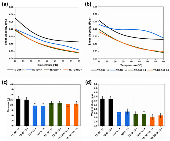 Shear viscosity (Pa.s) vs. temperature (a,b), and firmness (g) (c), and work of shear (g.s) (d) of all the produced TE.