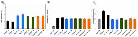Evaluation of transdermal skin permeation (a), tyrosinase inhibition (b), and elastase inhibition (c) of all TEs produced.