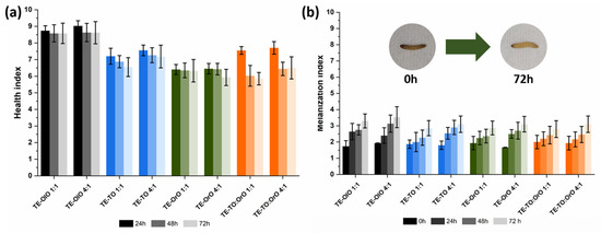 The larval health index is an important tool for assessing the overall health of G. mellonella, taking into account factors such as larval activity, cocoon formation, melanization, and survival [28]. The reaction of G. mellonella to specific cosmetic products or compounds provides an indication of its toxicity [14,39]. Assessment of larval health is critical for ensuring the reliability and safety of proposed TEs for future cosmetic applications. Figure 5a shows the health index of G. mellonella in the presence of the different TEs produced. The larval health index was found to be lower in TEs containing essential oils (TE-TO, TE-OrO, and TE-TO:OrO), suggesting a level of toxicity in compared to the control (TE-OlO). However, despite the reduced larval health indices for TE-TO, TE-OrO, and TE-TO:OrO, the results remain acceptable, as they are still above 6.