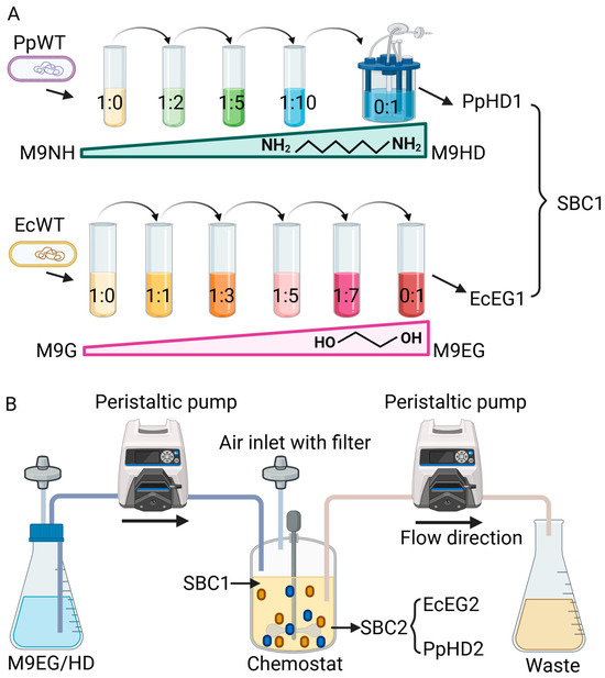 In the first-stage evolution, PpWT and EcWT were gradually adapted in M9 media with increasing concentrations of HD and EG, respectively. PpWT was evolved to obtain PpHD1 in modified M9 media with the increasing ratio of M9NH:M9HD from 1:0, 1:2, 1:5, 1:10, to 0:1 that reported in our previous study [,], while adaptive evolution of EcWT was evolved to obtain EcEG1 in the modified M9 media with the increasing ratio of M9G:M9EG from 1:0, 1:1, 1:3, 1:5, 1:7, to 0:1, respectively (Figure 1A).