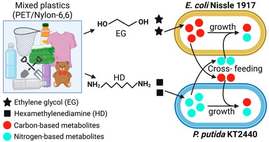 Our strategy employs an SBC, as it offers distinct advantages over single-species approaches. Individual microbes often face limitations in processing complex substrates, whereas consortia leverage the complementary metabolic strengths of different species []. This division of labor facilitates robust and efficient substrate utilization. Here, we designed a cross-feeding system (Figure 2) where one bacterial strain metabolizes EG and the other assimilates HD, creating mutual metabolic interdependence to support consortium growth.