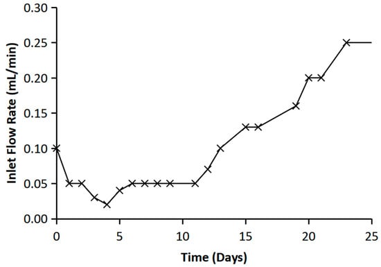 The inlet flow rate data were collected during the 25-day chemostat evolution experiment (Figure 3). During the initial stage, the inlet flow rate had to be decreased to maintain steady-state growth of SBC2 due to their weak and slow ability to utilize HD and EG. Throughout the experiment, the inlet flow rate was adjusted to sustain steady-state conditions. Initially, it was reduced to establish the first steady state at approximately 0.02–0.03 mL/min on days 3–4. Over the course of adaptive evolution, the flow rate gradually increased, indicating that the SBC adapted to more effectively utilize EG and HD as sole carbon and nitrogen sources, respectively.