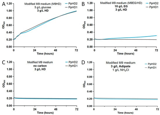 In contrast, when EG was used as the carbon source along with HD (Figure 4B), PpHD2 showed slight growth, while PpHD1 did not grow. This suggests that PpHD2 obtained a limited capacity to utilize EG as a carbon source during the second-stage coculture evolution. To investigate whether this slight growth might be attributed to the ability of PpHD2 to utilize adipate that generated from HD degradation, further experiments were conducted using media formulations shown in Figure 4C,D.