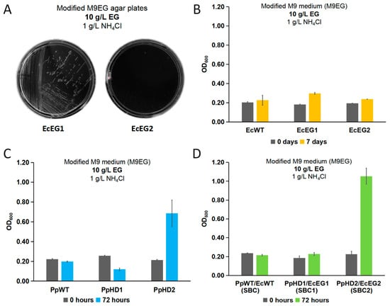 Growth of E. coli, P. putida and SBC strains in modified M9 media with EG as the carbon source. (A) Growth of EcEG1 and EcEG2 on M9EG agar plates. (B) Growth of E. coli strains in M9EG medium. (C) Growth of P. putida strains in M9EG media. (D) Growth in co-culture systems.