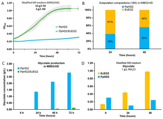 Growth dynamics and metabolic interactions of PpHD2 and EcEG2. (A) Growth curves of PpHD2 alone and in co-culture with EcEG2 in M9EG/HD. (B) Subpopulation composition of the coculture in M9EG/HD determined by 16S rRNA sequencing. (C) Glycolate production of PpHD2 alone and in co-culture with EcEG2 in M9EG/HD measured via HPLC. (D) Growth of PpHD2 and EcEG2 in M9 medium supplemented with glycolate as the sole carbon source.