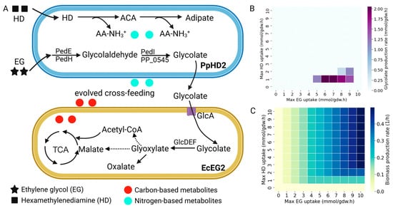 (A) The evolved cross-feeding module found in the SBC2. (B) Flux balance analysis (FBA) predicted the glycolate production rate (mmol/g DW h) in response to varying maximum uptake rates of EG and HD in modified metabolic conditions. (C) FBA predicted the biomass production rates (1/h) in response to varying maximum uptake rates of EG and HD in modified metabolic conditions.