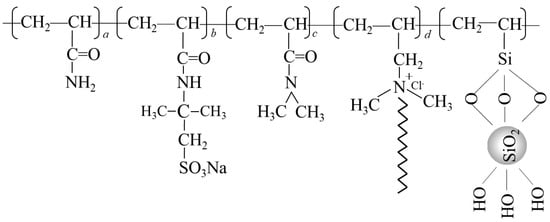 Therefore, the suspension stabilizer we developed is based on NNDMA and AMPS, with the introduction of two main functional monomers, namely, the modified nano-silica monomer and the long side-chain hydrophobic monomer, to enhance the high-temperature viscosity of the polymer and the suspension stability of the cement slurry. However, due to the fact that both the modified nano-silica monomer and the long side-chain hydrophobic monomer possess a certain degree of hydrophobicity, along with large steric hindrance and low reactivity, we innovatively adopted a method combining the addition of a small amount of AM monomer and emulsion polymerization. This effectively improved the degree of participation of the two functional monomers in the polymerization process and increased the monomer proportion of the two functional monomers in the polymer. Consequently, the viscosity of the polymer solution at medium and high temperatures was effectively enhanced, preventing the settlement of solid-phase particles such as weighting agents in the cement slurry, especially in high-density cement slurries, and effectively improving the settlement stability of high-temperature and high-density cement slurries. The molecular structural formula of the suspension stabilizer is shown in Figure 1.