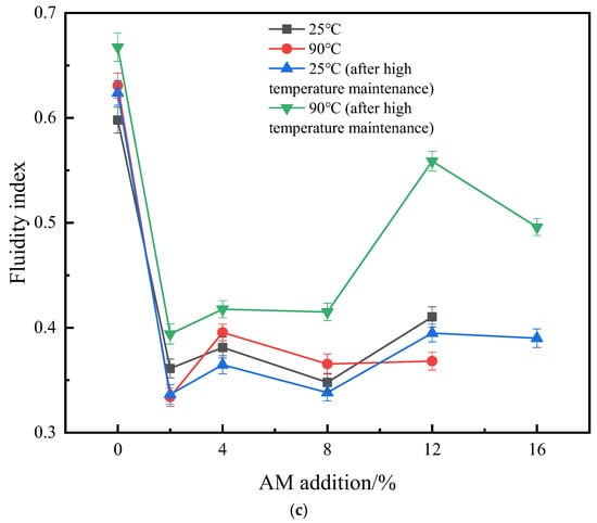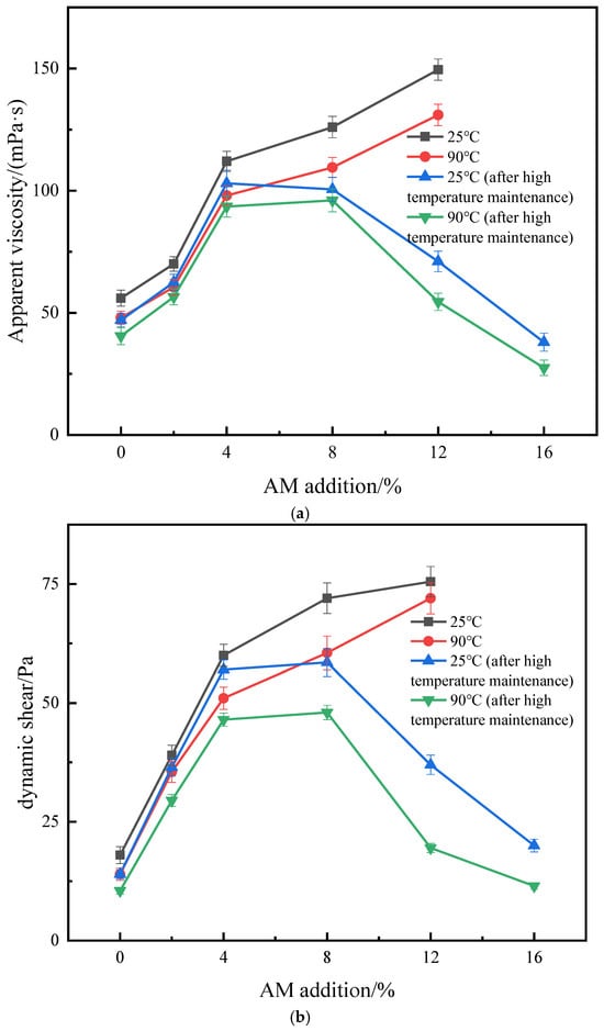 The effect of different AM monomer contents on the rheological properties of polymer solutions before and after high-temperature conditioning: (a) apparent viscosity; (b) dynamic shear; and (c) fluidity index. ① AM addition is the proportion of AM monomer to the total monomer mass. ② The viscosity before high-temperature conditioning exceeded the range of the six-speed viscometer when the AM monomer dosage was 16% of the total monomer mass; therefore, this set of data lacked the data before conditioning.