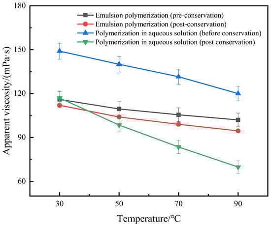 As shown in Figure 3, the synthesis method of emulsion polymerization can effectively improve the temperature resistance of the polymers and can slow the rate of decrease in the polymer solution with increasing temperature. This is because the synthesis method of emulsion polymerization can effectively increase the participation rate of long-hydrophobic-side-chain temperature-sensitive monomers as well as modified nano-SiO2 monomers during the polymerization process, which enhances the temperature resistance of the polymers.