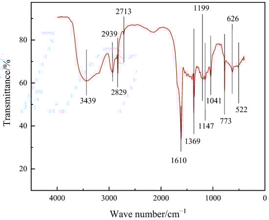 The IR spectra of SIAM-1 were tested, and it can be seen from Figure 4 that 2939 cm−1 and 2829 cm−1 are the characteristic absorption peaks of methyl and methylene groups; 3439 cm−1 and 1610 cm−1 are the characteristic absorption peaks of amide groups; 1199 cm−1 and 1147 cm−1 are the characteristic absorption peaks of sulfonate groups in AMPS; 1041 cm−1 are the characteristic absorption peaks of nanosized SiO2 in Si-O-Si, and 626 cm−1 is the characteristic absorption peak of the long-chain alkyl group in the long-hydrophobic-side-chain temperature-sensitive monomer. Therefore, our synthesized hydrophobic temperature-sensitive monomers contain amide groups, sulfonic acid groups, methyl groups, long-chain methylene groups, and other characteristic groups, which are completely consistent with the structure of the expected products.