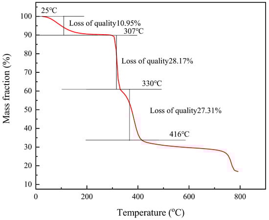 The thermogravimetric test of the suspension stabilizers was analyzed, and it can be seen from Figure 5 that the thermogravimetric curve of the suspension stabilizer can be divided into four stages. The first stage is 25–307 °C. This stage shows a decreasing and then flattening trend, with a decreasing section at lower temperatures because the polymer molecules have hydrophilic groups and adsorbed hydration groups, which are highly susceptible to water absorption and moisture in the air. Losses in this stage are mainly due to evaporation of water by heat. The second stage is 307–330 °C. The weight of the polymer decreases significantly in this stage with a weight loss of approximately 28.17 wt%. The loss of mass in this stage is due to the decomposition of a large number of side groups in the polymer molecule, such as amide groups and sulfonic acid groups. The third stage is 330–416 °C. The weight loss in this stage is further aggravated with a loss of approximately 27.31 wt.%. The mass loss in this stage is due to the breakage of the main chain of the polymer molecules and the gradual decomposition of the polymer molecules. The fourth stage is above 416 °C, and the weight of the polymer is stable, indicating that it has decomposed completely. The results show that the oil well cement suspension stabilizer has excellent thermal stability, and its molecular structure can be guaranteed to be intact below 307 °C.