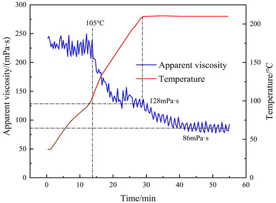 The rheological properties of the polymer solutions at high temperatures were evaluated using a HAAKE Mars high-temperature rheometer. SIAM-1 solution with a mass concentration of 0.40% was prepared, fully dissolved, and tested for its rheological properties at high temperatures and high pressures, and after reaching 210 °C, the temperature and shear rate were maintained constant and continued to be tested for 20 min, with a shear rate of 170 s−1 and a temperature range of 25~210 °C.