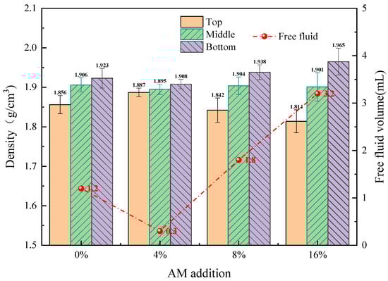 It can be clearly seen from Figure 9 that, when SIAM-1 was not added, the physical properties of the conventional-density and high-density cement slurries changed significantly under the condition of a high temperature of 210 °C. Specifically, the density differences between the upper and lower parts of the two slurries increased to 0.330 g∙cm−3 and 0.948 g∙cm−3, respectively, and meanwhile, the free fluid contents reached 12.8 mL and 21.2 mL, respectively. These parameter changes indicate that the solid-phase particles in the cement slurry settled significantly under the high temperature of 210 °C, putting the entire cement slurry system in an unstable settlement state, which will undoubtedly have an adverse impact on its practical application.