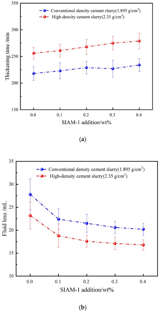 Effect of SIAM-1 on comprehensive performance of cement slurry: (a) thickening time and (b) fluid loss.