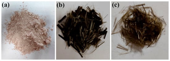 In laboratory studies, kaolin, a clay type composed of aluminum hydrosilicate (Al2Si2O5(OH)4) formed through the in situ weathering of volcanic/magmatic rocks, was chosen. K produced from the kaolin quarry in Balıkesir—Sındırgı (Türkiye) was used (Figure 1a). As the reinforcing material, 12 mm long BF produced from dark-colored, fine-grained volcanic rock was employed (Figure 1b).