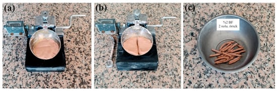 During the preparation of the reinforced clay samples, K dried in an oven at 105 °C for 24 h was mixed with BF separated by a compressor (Figure 1c) at the following percentages: 1.0%, 1.5%, 2.0%, 2.5%, and 3.0% by dry weight. LL and PL tests were conducted according to the ASTM D4318-17e1 standard [41] to determine the LL and PL values of the samples (Figure 2a–c). The LL values of the reinforced samples ranged from 38.80% to 42.30%, the PL values ranged from 26.00% to 28.00%, and the PI values ranged from 10.80% to 16.30%. All test results are presented in Table 3.