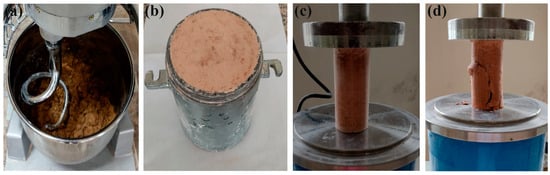 To ensure a homogeneous distribution of the BF within the clay during the preparation of the reinforced clay samples for unconfined compression tests, mixing was performed using a mixer and by hand (Figure 3a). The prepared mixtures were compacted at their wopt using the standard Proctor test according to the ASTM D698-12e2 standard [42] (Figure 3b), and cylindrical specimens for unconfined compression tests were extracted from the compacted samples.