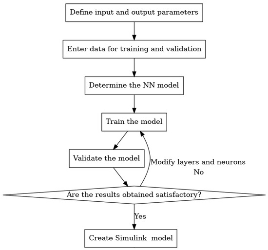 Figure 5 represents the fundamental steps in constructing and utilizing a NN model. Initially, the input and output parameters are defined based on the problem requirements. Following this, data are entered for training and validation purposes to ensure the model can learn and generalize effectively. Next, an appropriate NN model structure is determined, including factors like the number of layers and neurons. The model is then trained using the provided data, and its performance is validated against the validation dataset. If the obtained results are satisfactory, the process progresses to the creation of a Simulink of the model. However, if the results are not satisfactory, the process returns to the model training step, allowing for modifications to the number of layers and neurons to optimize the model’s accuracy and performance.