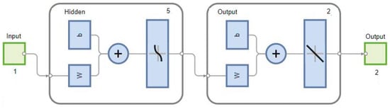 In this study, a single hidden layer was employed, as it was sufficient to model the relationships between the input and output variables. The architecture was optimized to achieve a balance between the learning capacity and computational efficiency. Figure 4 also shows the connections between these layers, emphasizing the flow of information from the input to the output layer through the hidden layer.