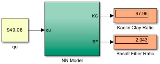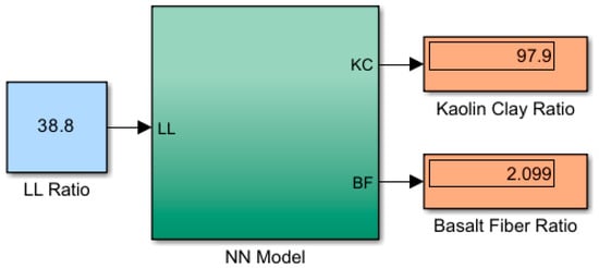 Separate NN models were developed in the Matlab/Simulink Environment based on the values of LL, PL, and qu. In each of the developed NN models, the appropriate output values for the BF and K proportions were predicted based on the input values. The Simulink block diagrams that generated outputs for the sample input values for each NN model are presented in Figure 8, Figure 9 and Figure 10.